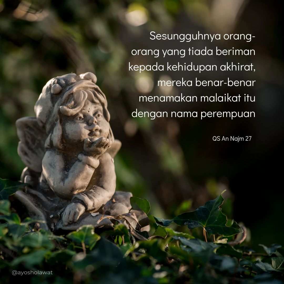 | Sesungguhnya orang-orang yang tiada beriman kepada kehidupan akhirat, mereka benar-benar menamakan malaikat itu dengan nama perempuan. | إِنَّ الَّذِينَ لا يُؤْمِنُونَ بِالآخِرَةِ لَيُسَمُّونَ الْمَلائِكَةَ تَسْمِيَةَ الأنْثَى | 27 |